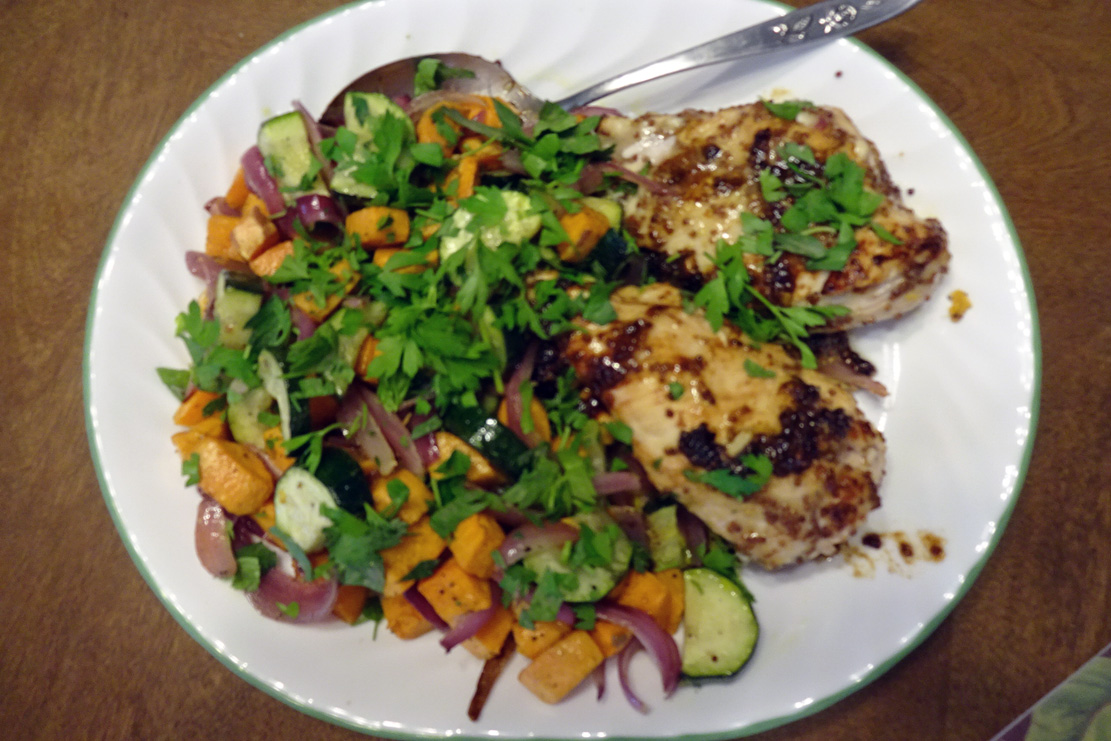 And we are having this tonight. Honey mustard chicken: chicken breasts, red onion, zucchini, sweet potatoes, garlic, honey, whole grain mustard, white wine vinegar, and parsley.
