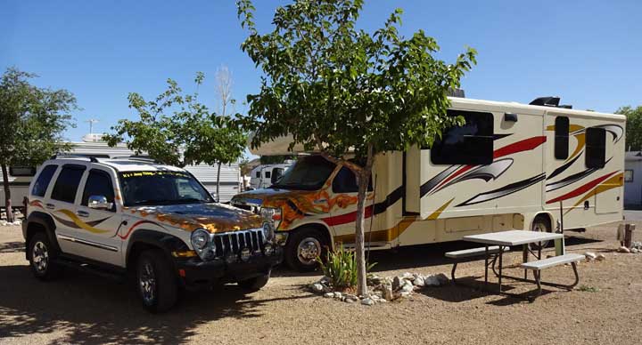 Hello from Beatty, NV. Only about 130 miles north of home. But it was a long drive. First driving across Las Vegas then up through Pahrump towards 95. Just after Bill mentioned how good the highway was we ran into road construction. 18 minutes waiting for the pilot car. Then back and forth through newly spread gravel. Clack, clack, clack - we could hear the rocks coming up and hitting us. Didn't see any new chips on the RV or the car thank goodness. Then on to the 95 - a very long boring road.
