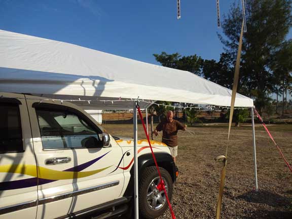 And here we are set up. Willie happy under his awning. A beautiful day here if it weren't for the humidity. In case you are wondering we are paying US$15.40 a day here, includes all utilities. And as soon as we can get down town we'll get our cable Internet hooked up again - we pay for it. Hopefully we'll be able to get our Dish network then.