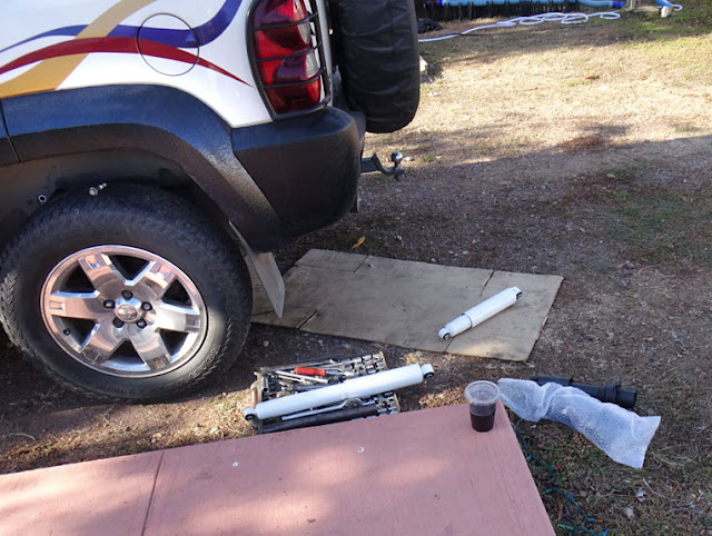 More unimportant blather from us. On Monday the mechanic came and changed the transmission fluid and filter in the RV. And then he put the new shocks on the rear of the Jeep. Got the same brand/style shocks that have been on it for 15 years.