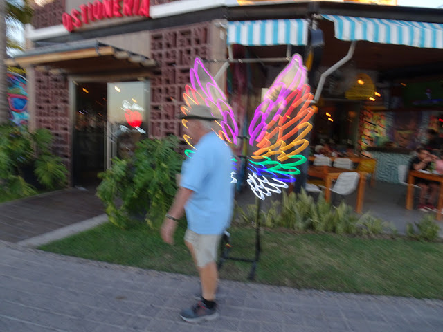 Just some of the boats in the Marina. Sure a lot more than the last few years. Glad to see that. This is an interesting restaurant and quite busy. Bill walking by the neon wings out if front of it.