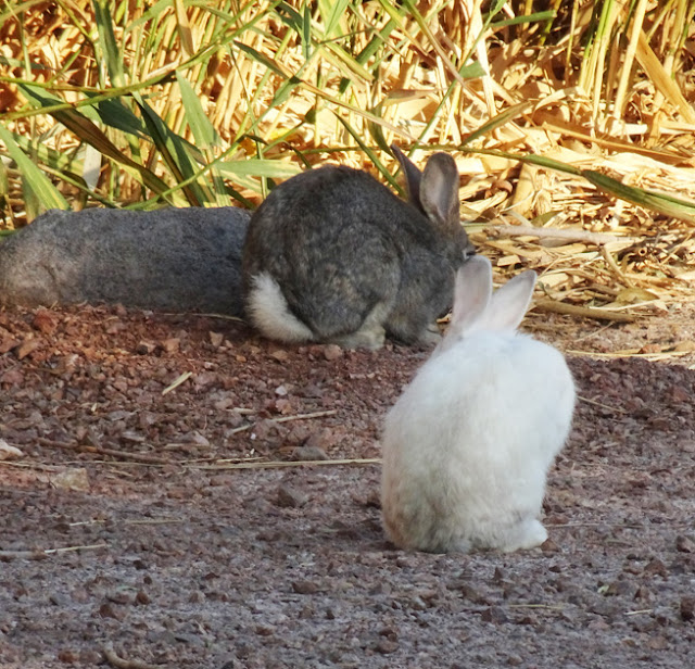 A couple more bunnies. I think I mentioned that someone released over 100 bunnies meant to be pets out here a month or so. Lots have been killed by the coyotes and many were captured by the staff. This guy so far has evaded both. Looks like he has made friends with a local. Hope he survives.